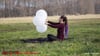 Dome sitzt im grünen Gras und spielt mit einigen Ballons die sie vorher aufgeblasen hat. Sie bringt die Ballons mit den fingern und drauf sitzen zum platzen.