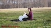 Dome sits in the green grass and plays with some balloons that she has previously inflated. She pops the balloons with her fingers and sits on them.