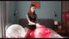 June sits on her bed and torments the poor balloons with her hands and fingernails.