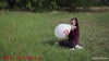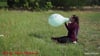 Dome bläst vier Ballons mit ihrem Mund so lange auf, bis diese zerplatzen.