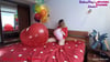 Hearts are broken today. The model inflates various heart balloons and pops them.