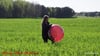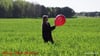 Cora steht auf einer Wiese und bläst zwei Ballons mit Hilfe einer Fußpumpe auf. Sie macht einen Knoten in die Ballons und wirft diese in den Himmel. Ab in die Freiheit.