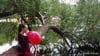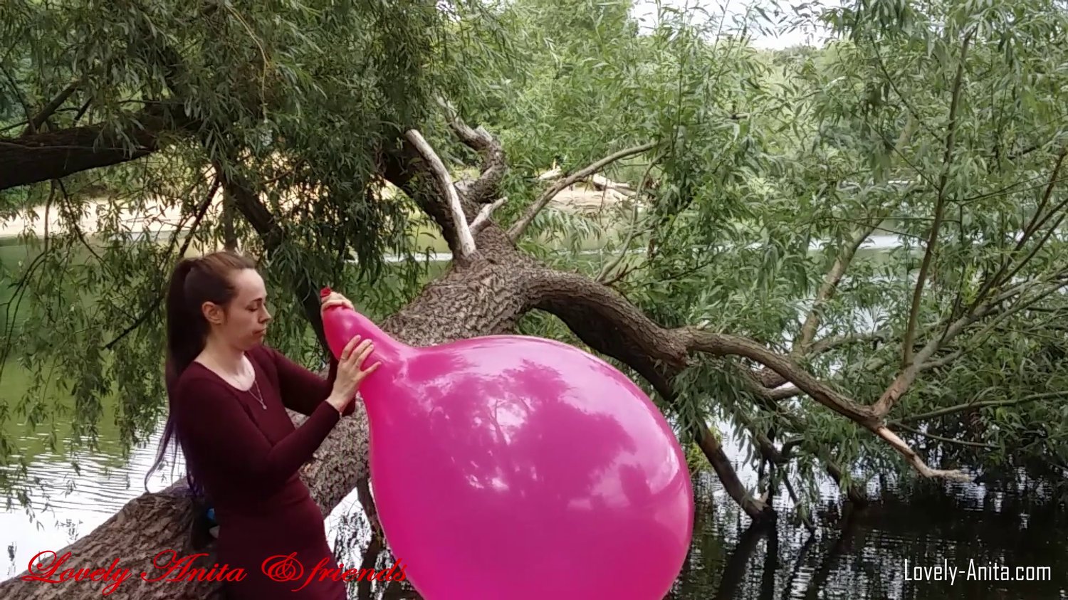 Dome stands by the lake and inflates a nice big balloon over and over. He's getting a great neck. Then she knots the balloon. Then she squeezes the balloon between her and a tree. You can see in her eyes how she likes it. Boom and the balloon pops.