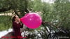 Dome steht am See und bläst einen schönen großen Ballon immer und immer weiter auf. Er bekommt einen tollen Hals. Dann verknotet sie den Ballon. Dann drück sie den Ballon zwischen sich und einen Baum. Man kann in ihren Augen sehen, wie es ihr gefällt. Boom und der Ballon knallt.