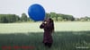 Dome inflates a big blue balloon with her mouth. He's getting nice and big and she's having a hard time holding him in the wind. As she struggles with him, it comes to where it had to come to.... he bursts.