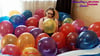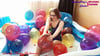 Das Model sitzt in einem Pool voll mit Ballons. Sie lässt einen Ballon nach dme anderen auf unterschiedlichste Art und Weise platzen.