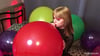Mindi bläst einen roten großen Ballon auf. Als er richtig prall und groß ist, verschließt sie den Ballon und legt sich drauf. Durch das Gewicht des ganzen körpers und heftiges wippen, knallt es am Ende.