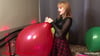 Mindi inflates a large red balloon. When it's really plump and big, she closes the balloon and lies on it. Due to the weight of the whole body and violent rocking, it bangs at the end.