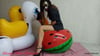 Nina trifft auf einen aufgeblasenen Wasserball, der wie eine riesige Melone aussieht. Sie setzt sich drauf und wippt etwas drauf umher. Das macht ihr Spaß ;-) Dann beschließt sie, die Luft aus der Melone durch das Ventil abzulassen.