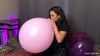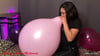 Adel inflates a pink balloon with her mouth until a neck forms on the balloon and it bursts at the end.