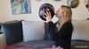 Xena inflates a balloon until it is so plump and finally bursts loudly.