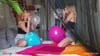 Sonea und ihre Freundin sitzen auf dem Bett und haben mit ein paar Ballons ihren Spaß. Die Ballons müssen ordentlich was aushalten und die quälerei über sich ergehen lassen.