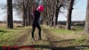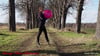 Dome steht in der Mitte einer Allee und bläst einen Ballon schon auf. Dann legt sie sen Ballon auf den Boden und stellt den Stiefel drauf. Der Ballon platzt ;-)