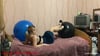 Alex torments two large balloons. The two large balloons are burst by biting.