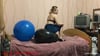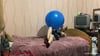 Alex quält zwei große Ballons. Die beiden großen Ballons werden durch beißen zum platzen gebracht.