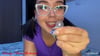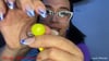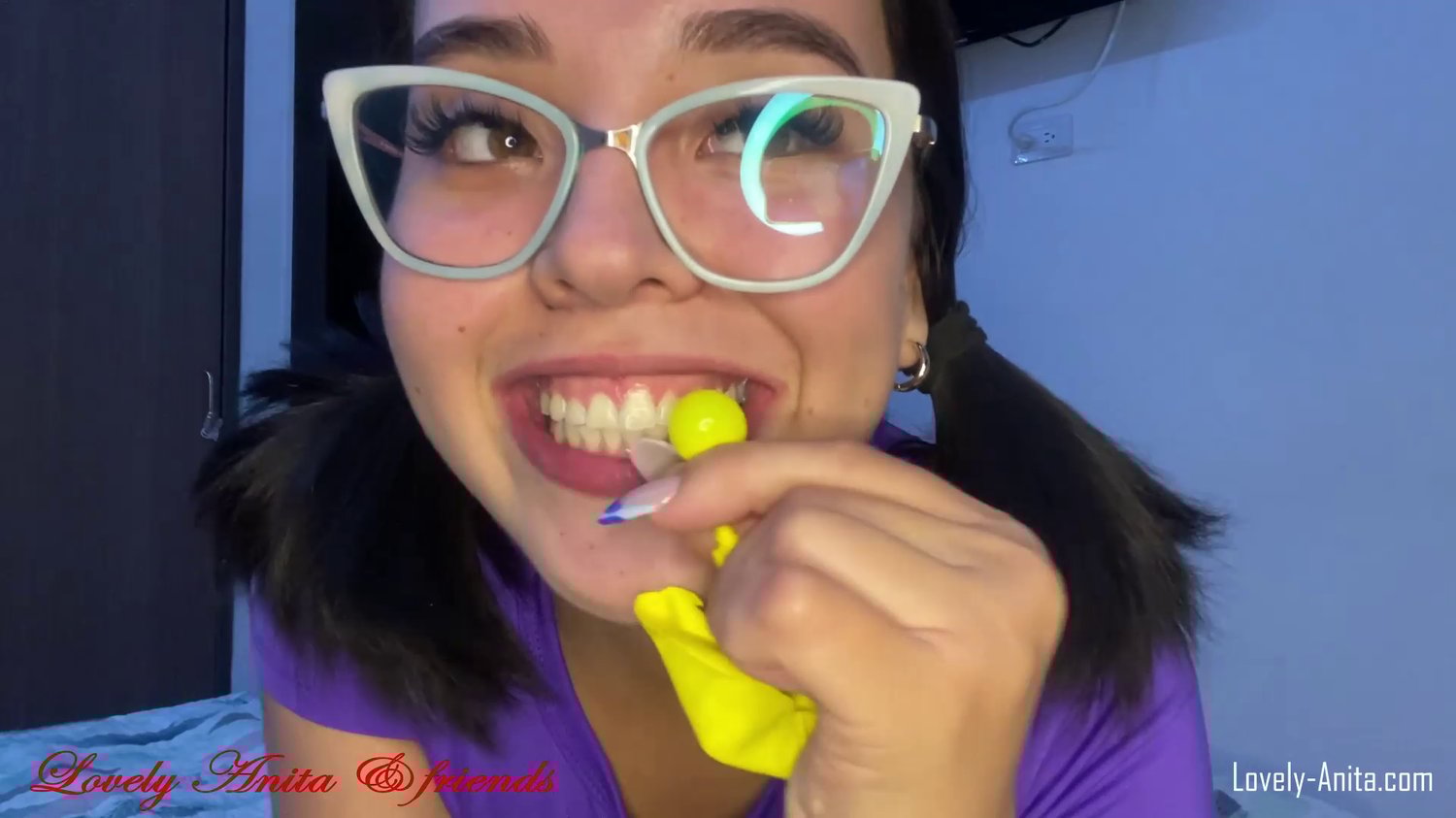 Andrea Escobar macht aus den ballon fetzen kleine Blasen, indem sie die Fetzen mit dem Mund ansaugt und dann zu dreht. Natürlich lässt sie die auch knallen.