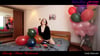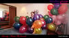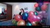 It's getting loud again in the studio today. The model is sitting on the bed with a cluster of balloons. You don't have to say much more about it. She torments all balloons with passion.