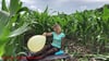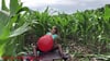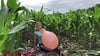 Alex sitzt in einem Maisfeld und bringt vier Ballons zum platzen. Drei durch sitzen und einer platzt durch die Blätter der Pflanzen.